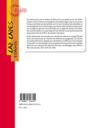 Destinée aux étudiants préparant le Capes, une présentation des différentes périodes littéraires, artistiques et culturelles en Espagne à travers une sélection de textes. L'ouvrage propose également une approche novatrice des textes classiques. Avec des repères chronologiques.