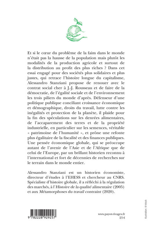 Et si le coeur du problème de la faim dans le monde n'était pas la hausse de la population mais plutôt les modalités de la production agricole et surtout de la distribution au profit des plus riches ? Dans cet essai engagé pour des sociétés plus solidaires et plus justes, qui retrace l'histoire longue du capitalisme, Alessandro Stanziani propose de renouer avec le contrat social cher à J.-J. Rousseau et de faire de la démocratie, de l'égalité sociale et de l'environnement les trois piliers du monde d'après. Défenseur d'une politique publique conciliant croissance économique et démographique, droits du travail, lutte contre les inégalités et protection de la planète, il plaide pour la fin des spéculations sur les denrées alimentaires, de l'accaparement des terres et de la propriété industrielle, en particulier sur les semences, véritable « patrimoine de l'humanité », et prône une refonte plus égalitaire de la fiscalité et des finances publiques. Une pensée économique globale, qui se préoccupe autant de l'avenir de l'Asie et de l'Afrique que de celui de l'Europe, par un brillant historien reconnu à l'international et fort de décennies de recherches sur le terrain dans le monde entier.