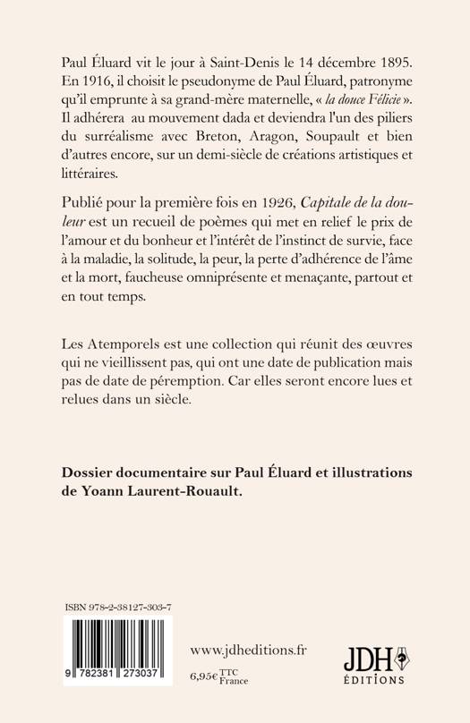 Paul Éluard vit le jour à Saint-Denis le 14 décembre 1895. En 1916, il choisit le pseudonyme de Paul Éluard, patronyme qu'il emprunte à sa grand-mère maternelle, « la douce Félicie ». Il adhérera au mouvement dada et deviendra l'un des piliers du surréalisme avec Breton, Aragon, Soupault et bien d'autres encore, sur un demi-siècle de créations artistiques et littéraires. Publié pour la première fois en 1926, Capitale de la douleur est un recueil de poèmes qui met en relief le prix de l'amour et du bonheur et l'intérêt de l'instinct de survie, face à la maladie, la solitude, la peur, la perte d'adhérence de l'âme et la mort, faucheuse omniprésente et menaçante, partout et en tout temps. Les Atemporels est une collection qui réunit des oeuvres qui ne vieillissent pas, qui ont une date de publication mais pas de date de péremption. Car elles seront encore lues et relues dans un siècle. Dossier documentaire sur Paul Éluard et illustrations de Yoann Laurent-Rouault.