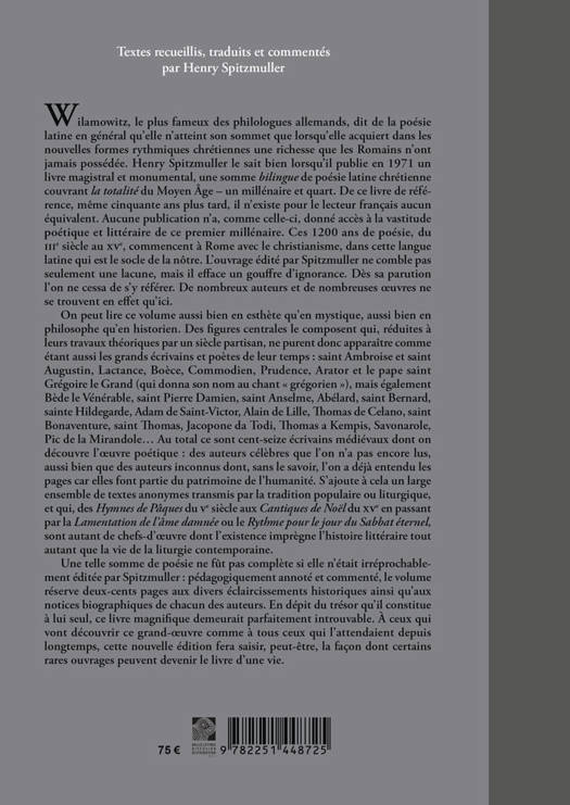 Wilamowitz, le plus fameux des philologues allemands, dit de la poesie latine en general qu'elle n'atteint son sommet que lorsqu'elle acquiert dans les nouvelles formes rythmiques chretiennes une richesse que les Romains n'ont jamais possedee. Henry Spitzmuller le sait bien lorsqu'il publie en 1971 un livre magistral et monumental, une somme bilingue de poesie latine chretienne couvrant la totalite du Moyen Age - un millenaire et quart. De ce livre de reference, meme cinquante ans plus tard, il n'existe pour le lecteur francais aucun equivalent. Aucune publication n'a, comme celle-ci, donne acces a la vastitude poetique et litteraire de ce premier millenaire. Ces 1200 ans de poesie, du IIIe siecle au XVe, commencent a Rome avec le christianisme, dans cette langue latine qui est le socle de la notre. L'ouvrage edite par Spitzmuller ne comble pas seulement une lacune, mais il efface un gouffre d'ignorance. Des sa parution l'on ne cessa de s'y referer. De nombreux auteurs et de nombreuses oevres ne se trouvent en effet qu'ici. On peut lire ce volume aussi bien en esthete qu'en mystique, aussi bien en philosophe qu'en historien. Des figures centrales le composent qui, reduites a leurs travaux theoriques par un siecle partisan, ne purent donc apparaitre comme etant aussi les grands ecrivains et poetes de leur temps: saint Ambroise et saint Augustin, Lactance, Boece, Commodien, Prudence, Arator et le pape saint Gregoire le Grand (qui donna son nom au chant gregorien ), mais egalement Bede le Venerable, saint Pierre Damien, saint Anselme, Abelard, saint Bernard, sainte Hildegarde, Adam de Saint-Victor, Alain de Lille, Thomas de Celano, saint Bonaventure, saint Thomas, Jacopone da Todi, Thomas a Kempis, Savonarole, Pic de la Mirandole... Au total ce sont cent-seize ecrivains medievaux dont on decouvre l'oeuvre poetique: des auteurs celebres que l'on n'a pas encore lus, aussi bien que des auteurs inconnus dont, sans le savoir, l'on a deja entendu les pages car elles font partie du patrimoine de l'humanite. S'ajoute a cela un large ensemble de textes anonymes transmis par la tradition populaire ou liturgique, et qui, des Hymnes de Paques du Ve siecle aux Cantiques de Noel du XVe en passant par la Lamentation de l'ame damnee ou le Rythme pour le jour du Sabbat eternel, sont autant de chefs-d'oeuvre dont l'existence impregne l'histoire litteraire tout autant que la vie de la liturgie contemporaine. Une telle somme de poesie ne fut pas complete si elle n'etait irreprochablement editee par Spitzmuller: pedagogiquement annote et commente, le volume reserve deux-cents pages aux divers eclaircissements historiques ainsi qu'aux notices biographiques de chacun des auteurs. En depit du tresor qu'il constitue a lui seul, ce livre magnifique demeurait parfaitement introuvable. A ceux qui vont decouvrir ce grand-oeuvre comme a tous ceux qui l'attendaient depuis longtemps, cette nouvelle edition fera saisir, peut-etre, la facon dont certains rares ouvrages peuvent devenir le livre d'une vie.