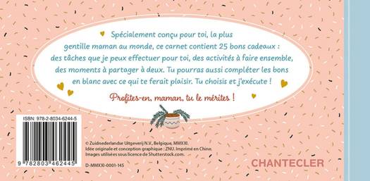 Spécialement conçu pour toi, la plus gentille maman au monde, ce carnet contient 25 bons cadeaux : des tâches que je peux effectuer pour toi, des activités à faire ensemble, des moments à partager à deux. Tu pourras aussi compléter les bons en blanc avec ce qui te ferait plaisir. Tu choisis et j'exécute !