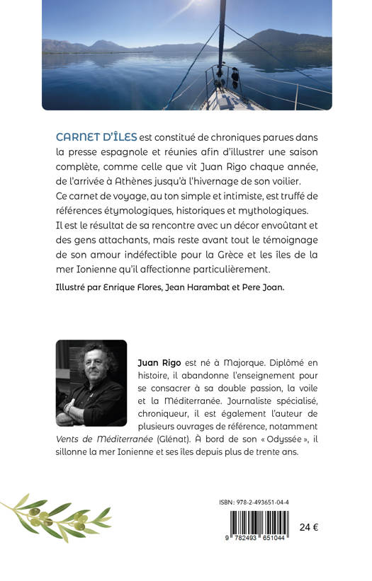 carnet d’îles est constitué de chroniques parues dans la presse espagnole et réunies afin d’illustrer une saison complète, comme celle que vit Juan Rigo chaque année, de l’arrivée à Athènes jusqu’à l’hivernage de son voilier. Ce carnet de voyage, au ton simple et intimiste, est truffé de références étymologiques, historiques et mythologiques. Il est le résultat de sa rencontre avec un décor envoûtant et des gens attachants, mais reste avant tout le témoignage de son amour indéfectible pour la Grèce et les îles de la mer Ionienne qu’il affectionne particulièrement.