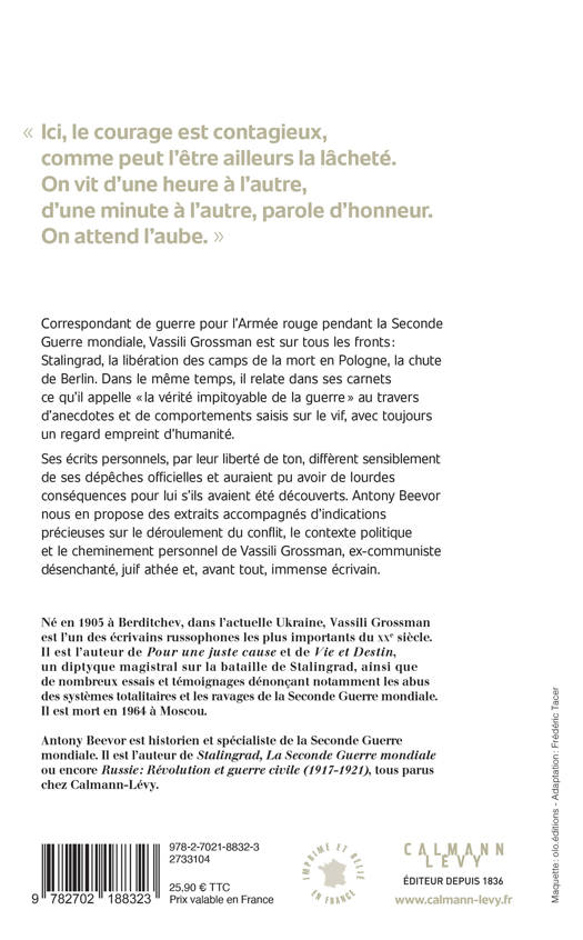 Ses écrits personnels, par leur liberté de ton, diffèrent sensiblement  de ses dépêches officielles et auraient pu avoir de lourdes  conséquences pour lui s’ils avaient été découverts. Antony Beevor  nous en propose des extraits accompagnés d’indications  précieuses sur le déroulement du conflit, le contexte politique  et le cheminement personnel de Vassili Grossman, ex-communiste  désenchanté, juif athée et, avant tout, immense écrivain.