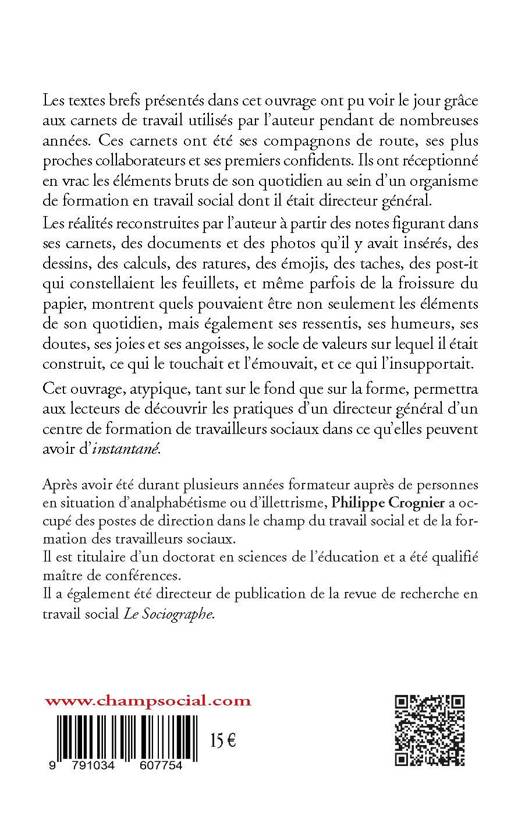 Les textes brefs présentés dans cet ouvrage ont pu voir le jour grâce aux carnets de travail utilisés par l’auteur pendant de nombreuses années. Ces carnets ont été ses compagnons de route, ses plus proches collaborateurs et ses premiers confidents. Ils ont réceptionné en vrac les éléments bruts de son quotidien au sein d’un organisme de formation en travail social dont il était directeur général. Les réalités reconstruites par l’auteur à partir des notes figurant dans ses carnets, des documents et des photos qu’il y avait insérés, des dessins, des calculs, des ratures, des émojis, des taches, des post-it qui constellaient les feuillets, et même parfois de la froissure du papier, montrent quels pouvaient être non seulement les éléments de son quotidien, mais également ses ressentis, ses humeurs, ses doutes, ses joies et ses angoisses, le socle de valeurs sur lequel il était construit, ce qui le touchait et l’émouvait, et ce qui l’insupportait. Cet ouvrage, atypique, tant sur le fond que sur la forme, permettra aux lecteurs de découvrir les pratiques d’un directeur général d’un centre de formation de travailleurs sociaux dans ce qu’elles peuvent avoir d’instantané.