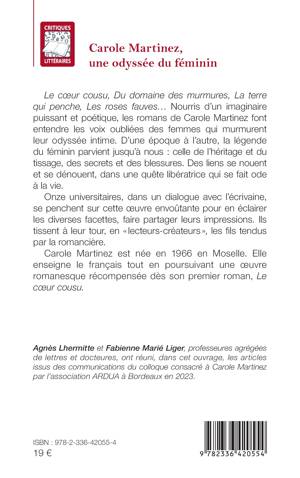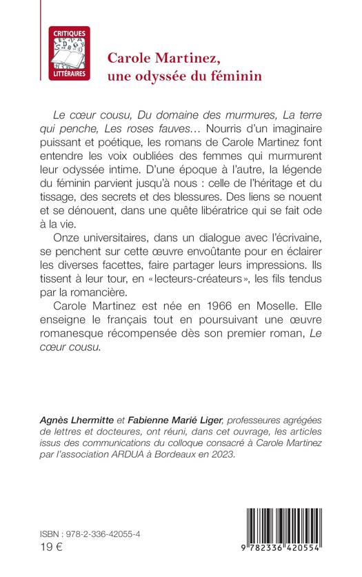 Le coeur cousu, Du domaine des murmures, La terre qui penche, Les roses fauves... Nourris d'un imaginaire puissant et poétique, les romans de Carole Martinez font entendre les voix oubliées des femmes qui murmurent leur odyssée intime. D'une époque à l'autre, la légende du féminin parvient jusqu'à nous celle de l'héritage et du tissage, des secrets et des blessures. Des liens se nouent et se dénouent, dans une quête libératrice qui se fait ode à la vie. Onze universitaires, dans un dialogue avec l'écrivaine, se penchent sur cette oeuvre envoûtante pour en éclairer les diverses facettes, faire partager leurs impressions. Ils tissent à leur tour, en lecteurs-créateurs, les fils tendus par la romancière. Carole Martinez est née en 1966 en Moselle. Elle enseigne le français tout en poursuivant une oeuvre romanesque récompensée dès son premier roman, Le coeur cousu.