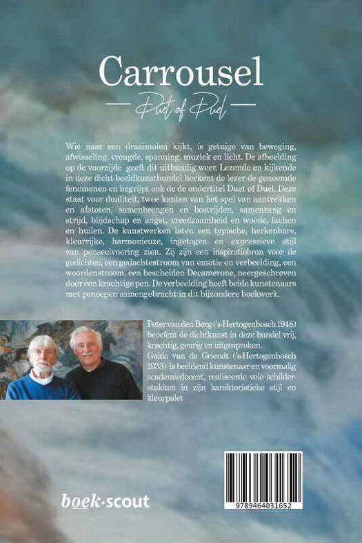Wie naar een draaimolen kijkt, is getuige van beweging, afwisseling, vreugde, spanning, muziek en licht. De afbeelding op de voorzijde geeft dit uitbundig weer. Lezende en kijkende in deze dicht-beeldkunstbundel herkent de lezer de genoemde fenomenen en begrijpt ook de de ondertitel Duet of Duel. Deze staat voor dualiteit, twee kanten van het spel van aantrekken en afstoten, samenbrengen en bestrijden, samenzang en strijd, blijdschap en angst, vreedzaamheid en woede, lachen en huilen. De kunstwerken laten een typische, herkenbare, kleurrijke, harmonieuze, ingetogen en expressieve stijl van penseelvoering zien.Zij zijn een inspiratiebron voor de gedichten, een gedachtestroom van emotie en verbeelding, een woordenstroom, een bescheiden Decamerone, neergeschreven door een krachtige pen. De verbeelding heeft beide kunstenaars met genoegen samengebracht in dit bijzondere boekwerk.