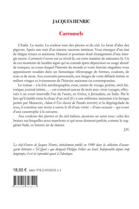L'Italie. Le matin. La couleur rose des pierres et du ciel. Le bruit d'ailes des pigeons. Après une nuit d'un intense vacarme intérieur. Vous émergez d'un état de fatigue tenace et ancienne. Harassé et pourtant doué étrangement d'une énergie neuve. Carrousels s'ouvre sur ce réveil-là, sur cette manière de naissance-là. Un de ces moments de lucidité aiguë qu'on connaît après dépression ou usage abusif de toxiques, au cours duquel l'histoire du monde et votre histoire singulière vous apparaissent soudain dans un fantastique télescopage de formes, couleurs, de sons et de mots. Aux souvenirs personnels, aux images de votre débâcle intime se mêlent visages et événements de l'histoire ancienne ou contemporaine. Le roman - à la fois autobiographie, essai, carnet de voyage, poème, récit historique, journal intime... - est construit autour de trois axes : trois voyages, effectués à un court intervalle l'un de l'autre, en Grèce, à Jérusalem, en Italie.