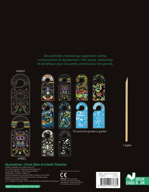 Une pochette contenant 10 accroche-portes à gratter, avec des couleurs d'encres différentes : « Silence, je dors ! », « Mot de passe exigé », « Défense d'entrer »... Il suffit de suivre les pas à pas illustrés pour créer et personnaliser la porte de sa chambre selon ses envies du moment ! Un stylet en bois est fourni.