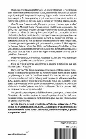 Stars ou inconnus, Casablanca, l’aventure du film leur rend hommage et retrace la grande aventure de leurs parcours. Mais ce n’est pas tout, Casablanca a encore à nous dire sur son histoire et sur l’Histoire. Dans ce livre, Tito Topin nous raconte également les dessous historiques et les hasards qui ont fait du film un succès mondial : qui aurait pu prévoir que le nom de Casablanca serait à la une des journaux parce qu’une armada américaine débarquerait dans cette ville en novembre 1942, quelques jours avant la projection du film à Los Angeles ? Qu’il serait sur toutes les lèvres parce que Roosevelt, Churchill et De Gaulle allaient choisir de s’y réunir lors de la conférence d’Anfa en janvier 1943, au moment de sa sortie nationale ?