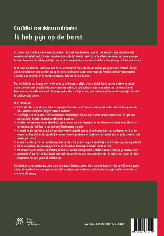 Als doktersassistent ben je een ware duizendpoot. Je voert uiteenlopende taken uit. Het beroep brengt bovendien veel verantwoordelijkheid met zich mee: zowel de patiënt als de huisarts rekent op je. Een kleine vergissing kan grote gevolgen hebben. Daarom is het belangrijk dat je over de juiste competenties en kennis beschikt en deze geïntegreerd toe kunt passen.In de serie werkboeken ‘Casuïstiek voor de doktersassistent’ staat steeds een andere groep patiënten centraal. Telkens gaat het om mensen met klachten die op het eerste gezicht op elkaar lijken maar die verschillende oorzaken hebben. Zo hebben de patiënten in dit werkboek allemaal last van pijn op de borst.De serie helpt je om je goed voor te bereiden op de beroepspraktijk, met casuïstiek kun je op een prettige en veilige manier oefenen met verschillende zorgvragen. Via praktische opdrachten kom je in aanraking met de verschillende kerntaken van de doktersassistent. Sommige opdrachten maak je alleen, andere voer je uit in een klein groepje of met al je studiegenoten samen.In dit werkboek: • Om de klachten van patiënten beter te begrijpen bestudeer je de bouw en werking van de borstkas en de organen die zich daarbinnen bevinden: longen, hart en slokdarm. • Je verdiept je in een aantal veel voorkomende aandoeningen die pijn op de borst kunnen veroorzaken. Je kijkt naar alarmfactoren en voert intakegesprekken met patiënten.• Je oefent het opmeten van de bloeddruk, het uitvoeren van een vingerprik en het afnemen van bloed door middel van een venapunctie. Ook leer je hoe een hartfilmpje gemaakt wordt.• Je maakt kennis met een aantal geneesmiddelen die gebruikt worden bij de behandeling van problemen met hart en bloedvaten. Hoe werken deze medicijnen en wat moet je patiënten vertellen over demanier waarop ze deze wel en niet moeten gebruiken?• Je oefent met het geven van voorlichting. Daarbij sta je stil bij de vraag wat een klantgerichte benadering eigenlijk inhoudt.• Ook de verwerking van patiëntgegevens in het Huisartsen Informatie Systeem komt aan bod.• Doktersassistenten kunnen in aanraking komen met allerlei beroepsrisico’s. Welke zijn dat en hoe ga je daarmee om?• Aandoeningen aan hart en bloedvaten zijn vaak een gevolg van een ongezonde leefstijl. Je ontdekt dat ook in ons land overgewicht een snel groeiend probleem is. De opleiding is een belangrijke start, maar een goede doktersassistent blijft zich ook daarna verder ontwikkelen. Daarom eindigt dit werkboek met een opdracht om zicht te krijgen op je sterke en zwakke kanten en op je ambitie om verder te groeien in dit beroep.