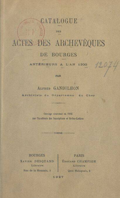 Après avoir fixé la chronologie des archevêques, et en avoir rappelé les principaux éléments historiques, Alfred Gandilhon, archiviste du département du Cher, dresse l’inventaire des actes passés sous leur sceau jusque l’an 1200.