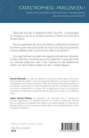 Génocide, écocide, 11 septembre 2001, Covid-19, la catastrophe se conjugue au pluriel et s’impose comme un thème récurrent dans l’espace public. Peut-on apprendre des récits indicibles sur la Shoah ou Hiroshima ? Comment parler des catastrophes en cours ? Les discours peuvent-ils rendre crédibles celles à venir et nous aider à les prévenir ? L’ouvrage s’adresse à un public de linguistes, économistes, historiens, juristes, littéraires, humanitaires et, plus largement, à toute personne qui souhaite (re)donner sens à des ruptures ou des événements inédits, loin des sombres prédictions des « collapsologues ».