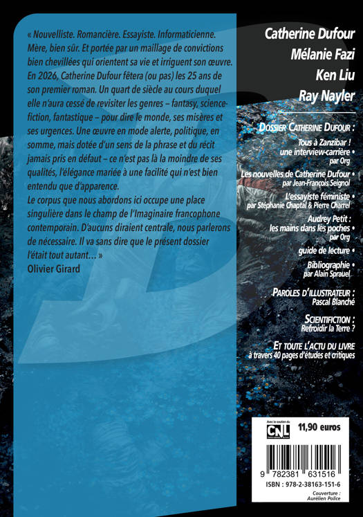 « Nouvelliste. Romancière. Essayiste. Informaticienne. Mère, bien sûr. Et portée par un maillage de convictions bien chevillées qui orientent sa vie et irriguent son oeuvre. En 2026, Catherine Dufour fêtera (ou pas) les 25 ans de son premier roman. Un quart de siècle au cours duquel elle n'aura cessé de revisiter les genres -