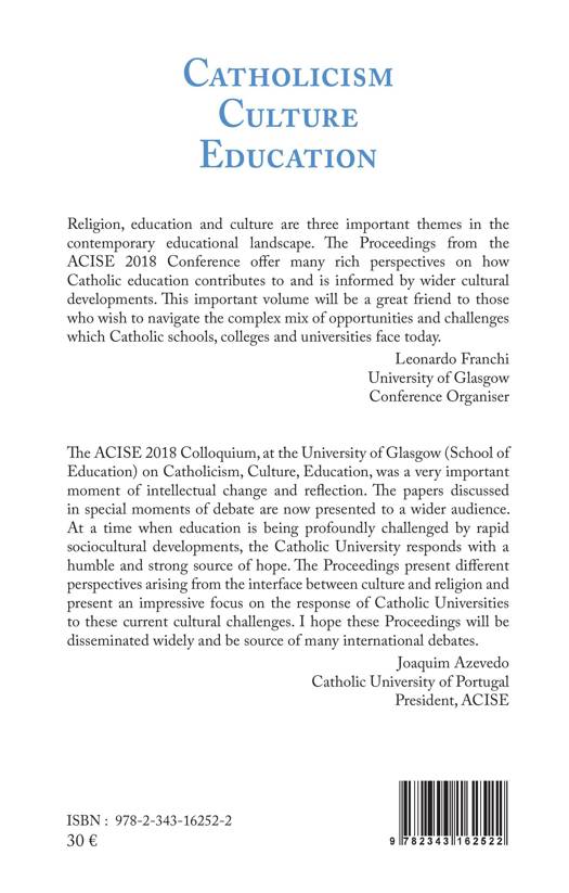 The ACISE 2018 Colloquium, at the University of Glasgow (School of Education) on Catholicism, Culture, Education, was a very important moment of intellectual change and reflection. The papers discussed in special moments of debate are now presented to a wider audience. At a time when education is being profoundly challenged by rapid sociocultural developments, the Catholic University responds with a humble and strong source of hope. The Proceedings present different perspectives arising from the interface between culture and religion and present an impressive focus on the response of Catholic Universities to these current cultural challenges. I hope these Proceedings will be disseminated widely and be source of many international debates.