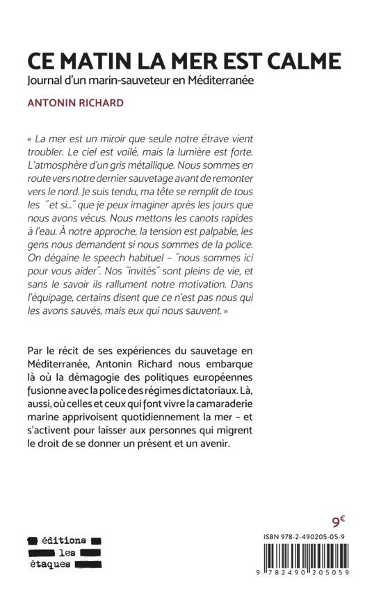 Par le récit de ses expériences du sauvetage en Méditerranée, Antonin Richard nous embarque là où la démagogie des politiques européennes fusionne avec la police des régimes dictatoriaux. Là, aussi, ou` celles et ceux qui font vivre la camaraderie marine apprivoisent quotidiennement la mer - et s'activent pour laisser aux personnes qui migrent le droit de se donner un présent et un avenir.