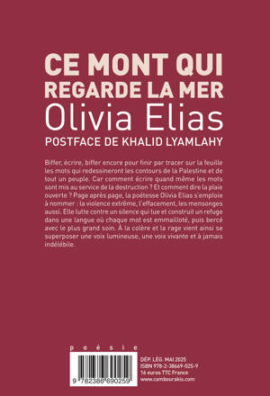 Biffer, écrire, biffer encore pour finir par tracer sur la feuille les mots qui redessineront les contours de la Palestine et de tout un peuple. Car comment écrire quand même les mots sont mis au service de la destruction ? Et comment dire la plaie ouverte ? Page après page, la poétesse Olivia Elias s'emploie à nommer : la violence extrême, l'effacement, les mensonges aussi. Elle lutte contre un silence qui tue et construit un refuge dans une langue où chaque mot est emmailloté, puis bercé avec le plus grand soin. À la colère et la rage vient ainsi se superposer une voix lumineuse, une voix vivante et à jamais indélébile.