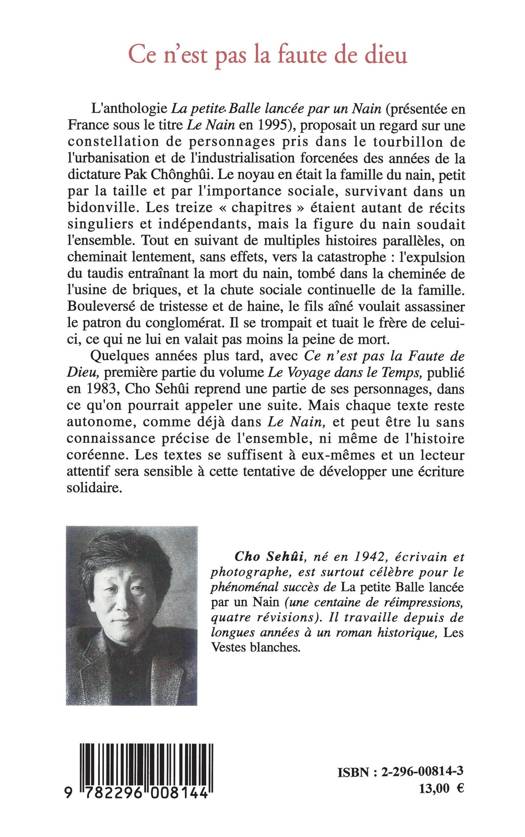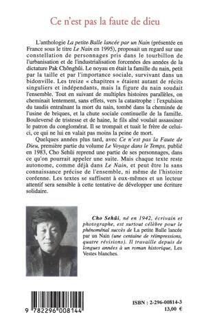 Première partie du volume "Le Voyage dans le temps", "Ce n'est pas la faute de Dieu" reprend plusieurs figures de l'anthologie "La petite balle lancée par un nain" (présentée en France sous le titre Le Nain en 1995). Ce livre proposait un regard sur une constellation de personnages pris dans le tourbillon de l'urbanisation et de l'industrialisation forcenées des années de la dictature Pak Chônghûi. Chaque texte du présent recueil reste autonome.