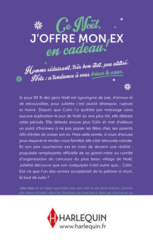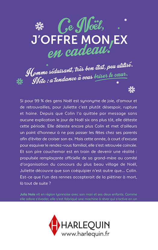 Si pour 99 % des gens Noël est synonyme de joie, d’amour et de retrouvailles, pour Juliette c’est plutôt désespoir, rupture et haine. Depuis que Colin l’a quittée par message sans aucune explication le jour de Noël six ans plus tôt, elle déteste cette période. Elle déteste encore plus Colin et met d’ailleurs un point d’honneur à ne pas passer les fêtes chez ses parents afin d’éviter de croiser son ex. Mais cette année, à court d’excuse pour esquiver le rendez-vous familial, elle s’est retrouvée coincée. Et son pire cauchemar est en train de devenir une réalité : propulsée remplaçante officielle de sa grand-mère au comité d’organisation du concours du plus beau village de Noël, Juliette découvre que son coéquipier n’est autre que… Colin. Est-ce que l’un des rennes accepterait de la piétiner à mort, là tout de suite ?