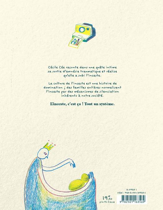 Cécile Cée raconte dans une quête intime sa sortie d'amnésie traumatique et réalise qu’elle a subi l'inceste. La culture de l'inceste est une histoire de domination ; des familles entières normalisent l’inceste par des mécanismes de silenciation inhérents à notre société. L’inceste, c’est ça ! Tout un système.
