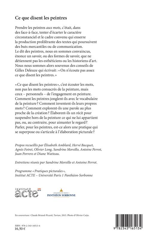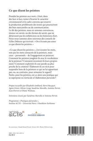 Prendre les peintres aux mots, c’était, dans des face-à-face, tenter d’écarter le caractère circonstanciel et le cadre convenu qui enserre la production proliférante des textes qui poursuivent des buts mercantiles ou de communication. Le dit des peintres énonce un savoir ou des formes de connaissance, que ne détiennent pas les esthéticiens ou les historiens d’art. Cet ouvrage recueille les témoignages de Claude Briand-Picard – Bernard Cousinier - Dominique De Beir – Monique Frydman - Speedy Graphito – Jean Le Gac - Florindo Nanni – Aurore Pallet Paul Rebeyrolle – Florence Reymond.
