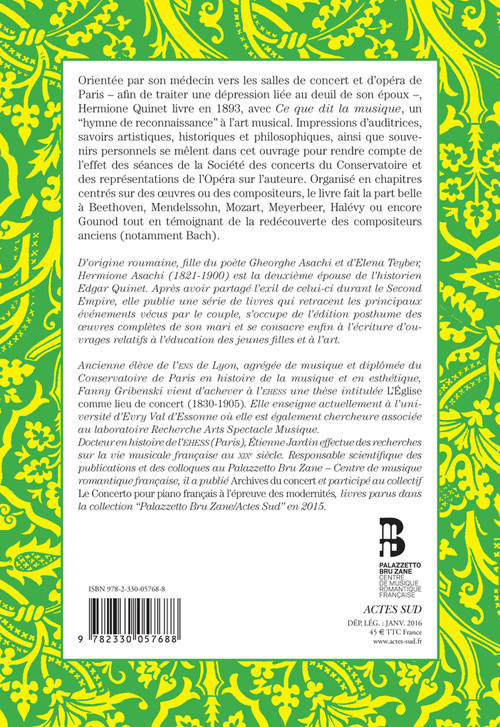 Impressions d'auditrices, savoirs artistiques, historiques et philosophiques, ainsi que souvenirs personnels se mêlent dans cet ouvrage pour rendre compte de l'effet des séances de la Société des concerts du Conservatoire et des représentations de l'Académie nationale de musique sur l'auteure.