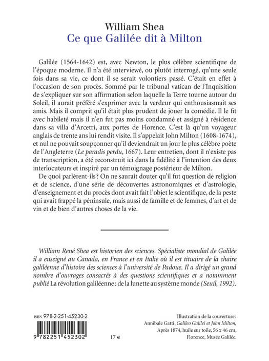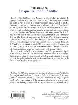 Galilee (1564-1642) est, avec Newton, le plus celebre scientifique de l'epoque moderne. Il n'a ete interviewe, ou plutot interroge, qu'une seule fois dans sa vie, ce dont il se serait volontiers passe. C'etait en effet a l'occasion de son proces. Somme par le tribunal vatican de l'Inquisition de s'expliquer sur son affirmation selon laquelle la Terre tourne autour du Soleil, il aurait prefere s'exprimer avec la verdeur qui enthousiasmait ses amis. Mais il comprit qu'il e'tait plus prudent de jouer la comedie. Il le fit avec habilete mais il n'en fut pas moins condamne et assigne a residence dans sa villa d'Arcetri, aux portes de Florence. C'est la qu'un voyageur anglais de trente ans lui rendit visite. Il s'appelait John Milton (1608-1674), et nul ne pouvait soupconner qu'il deviendrait un jour le plus celebre poete de l'Angleterre (Le paradis perdu, 1667). Leur entretien, dont il n'existe pas de transcription, a ete reconstruit ici dans la fidelite a l'intention des deux interlocuteurs et inspire par un temoignage posterieur de Milton. De quoi parlerent-ils ? On ne saurait douter qu'il fut question de religion et de science, d'une serie de decouvertes astronomiques et d'astrologie, d'enseignement et du proces dont avait fait l'objet le scientifique, de la peste qui avait frappe la peninsule, mais aussi de famille et de femmes, d'art et de vin et de bien d'autres choses de la vie.