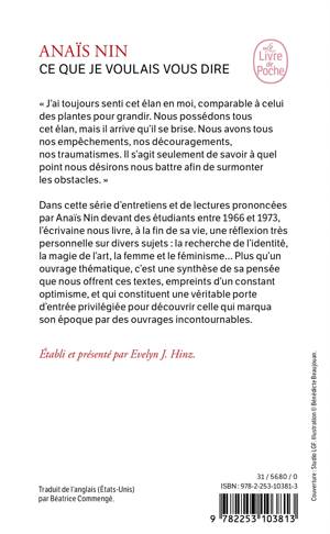 Dans cette série d’entretiens et de lectures prononcées par Anaïs Nin devant des étudiants entre 1966 et 1973, l’écrivaine nous livre, à la fin de sa vie, une réflexion très personnelle sur divers sujets : la recherche de l’identité, la magie de l’art, la femme et le féminisme… Plus qu’un ouvrage thématique, c’est une synthèse de sa pensée que nous offrent ces textes, empreints d’un constant optimiste, et qui constituent une véritable porte d’entrée privilégiée pour découvrir celle qui marqua son époque par des ouvrages incontournables.