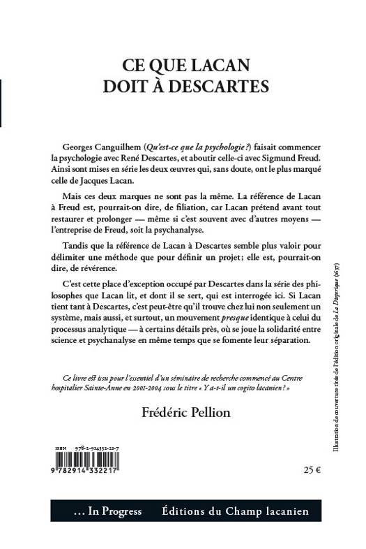 Georges Canguilhem faisait commencer la psychologie avec René Descartes, et aboutir celle-ci avec Sigmund Freud. Ainsi sont mises en série les deux oeuvres, qui sans doute, ont le plus marqué celle de Jacques Lacan. Mais ces deux marques ne sont pas la même. La référence de Lacan à Freud est de filiation, car Lacan prétend avant tout restaurer et prolonger - même si c'est souvent avec d'autres moyens - l'entreprise de Freud, soit la psychanalyse. Tandis que la référence de Lacan à Descartes semble plus valoir pour délimiter une méthode que pour définir un projet ; elle est de révérence. Il s'agit de la place d'exception occupée par Descartes dans la série des philosophes que Lacan lit, et dont il se sert. Si Lacan tient tant à Descartes, c'est qu'il trouve chez lui non seulement un système, mais aussi un mouvement presque identique à celui du processus analytique - à certains détails près, oùse joue la solidarité entre science et psychanalyse, et où se fomente leur séparation