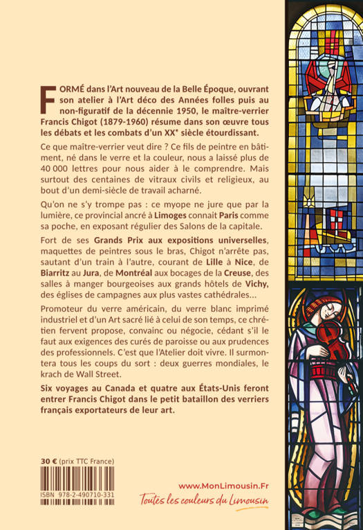 Que sait-on de Francis CHIGOT, maître-verrier limousin formé dans l’Art nouveau et qui exerça son métier jusqu’en 1960, hormis qu’il fût le créateur des vitraux de la gare de Limoges ? On disposait — chance très rare — des importantes archives de son atelier : environ 40 000 doubles de lettres envoyées sur un demi-siècle et des centaines de maquettes. Trois années de travail ont été nécessaires à François LANDRIES et Martine TANDEAU de MARSAC pour faire sortir de l’ombre le chef d’entreprise et sa production, plongés au cœur des débats qui ont marqué l’histoire de l’Art sacré du XXe siècle. Qu’on ne s’y trompe pas : ce myope ne jure que par la lumière, ce provincial ancré à Limoges connait Paris comme sa poche, en exposant régulier des Salons de la capitale. Fort de ses Grands Prix aux expositions universelles, maquettes de peintres sous le bras, Chigot n’arrête pas, sautant d’un train à l’autre, courant de Lille à Nice, de Biarritz au Jura, de Montréal aux bocages de la Creuse, des salles à manger bourgeoises aux grands hôtels de Vichy, des églises de campagnes aux plus vastes cathédrales... Six voyages au Canada et quatre aux États-Unis feront entrer Francis Chigot dans le petit bataillon des verriers français exportateurs de leur art.