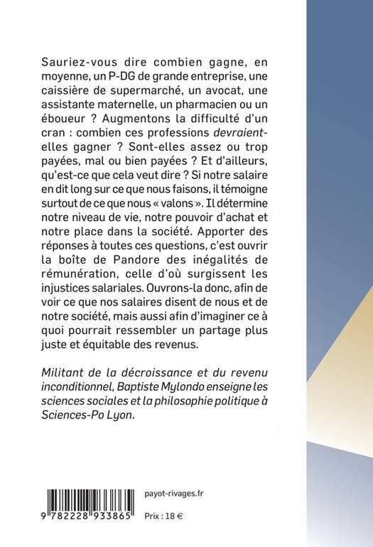 Sauriez-vous dire combien gagne, en moyenne, un P-DG de grande entreprise, une caissière de supermarché, un avocat, une assistante maternelle, un pharmacien ou un éboueur ? Augmentons la difficulté d'un cran : combien ces professions devraient-elles gagner ? Sont-elles assez ou trop payées, mal ou bien payées ? Et d'ailleurs, qu'est-ce que cela veut dire ? Si notre salaire en dit long sur ce que nous faisons, il témoigne surtout de ce que nous "valons". Il détermine notre niveau de vie, notre pouvoir d'achat et notre place dans la société. Apporter des réponses à toutes ces questions, c'est ouvrir la boîte de Pandore des inégalités de rémunération, celle d'où surgissent les injustices salariales. Ouvrons-la donc, afin de voir ce que nos salaires disent de nous et de notre société, mais aussi afin d'imaginer ce à quoi pourrait ressembler un partage plus juste et équitable des revenus.