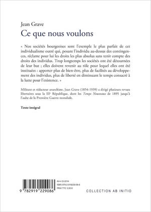 Edité par sa revue les Temps Nouveaux, ce texte de Jean Grave fait partie d’une collection de brochures dite de propagande. Pour quelques centimes de l’époque, chacun pouvait avoir accès à une littérature socialiste et anarchiste ; bien souvent des écrits engagés de militants, abordant des thèmes proches des préoccupations prolétariennes, mais aussi des synthèses d’œuvres plus complexes, visant à faire connaître les thèses libertaires aux moins instruits. Avec Ce que nous voulons, Jean Grave expose succinctement les raisons de son engagement politique — et à travers lui, le combat que mènent les anarchistes de son temps — en soulignant les axiomes de la société bourgeoise (autorité, hiérarchie, individualisme et salariat), pour mieux définir les contours de la société nouvelle : celle que les anarchistes souhaitent. Loin du désordre social, sans cesse et toujours annoncé par ses détracteurs, l’idéal libertaire, qui se dessine sous la prose de Jean Grave, pose les bases d’une organisation sociale régénérée — d’un nouvel ordre social — où l’homme est remis au centre du jeu ; où chacun, devenu citoyen-producteur, s’insère librement dans un système d’autogestion, et participe directement à la prise de décision politique : penser, parler et agir librement. Plus que centenaire, ce texte n’a perdu ni sa force ni sa juste analyse des réalités de la société. © Mazeto Square.