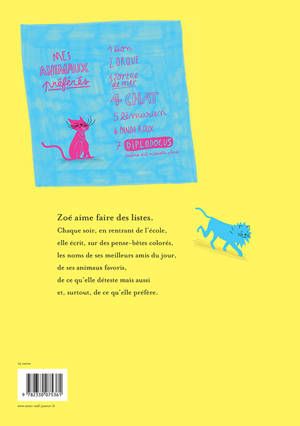 Zoé aime faire des listes. Sur des pense-bêtes colorés, elle écrit, dans le bon ordre, les noms de ses meilleurs amis du jour, de ses animaux favoris, de ce qu'elle déteste mais aussi et, surtout, de ce qu'elle préfère. À travers sa petite manie de tout lister, ce sont ses préoccupations, son univers de petite fille qui sont racontés et mis en images avec fantaisie.