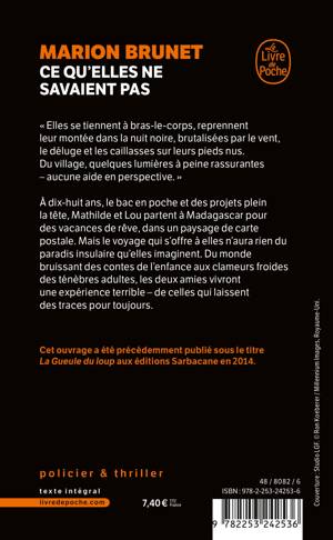 À dix-huit ans, le bac en poche et des projets plein la tête, Mathilde et Lou partent à Madagascar pour des vacances de rêve, dans un paysage de carte postale. Mais le voyage qui s’offre à elles n’aura rien de l’idylle insulaire qu’elles imaginent. Du monde bruissant des contes de l’enfance aux clameurs froides des ténèbres adultes, les deux amies vivront une expérience terrible – de celles qui laissent des traces pour toujours.