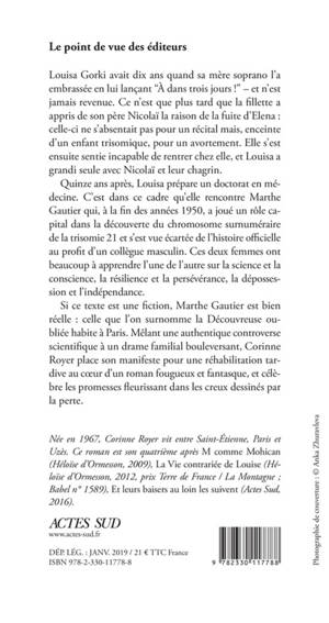 Quinze ans après, Louisa prépare un doctorat en médecine. C'est dans ce cadre qu'elle rencontre Marthe Gautier qui, à la fin des années 1950, a joué un rôle capital dans la découverte du chromosome surnuméraire de la trisomie 21 et s'est vue écartée de l'histoire officielle au profit d'un collègue masculin. Ces deux femmes ont beaucoup à apprendre l'une de l'autre sur la science et la conscience, la résilience et la persévérance, la dépossession et l'indépendance.