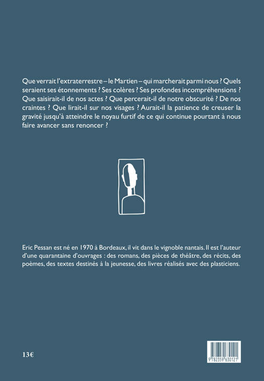 Que verrait l'extraterrestre - le Martien - qui marcherait parmi nous ? Quels seraient ses étonnements ? Ses colères ? Ses profondes incompréhensions ? Que saisirait-il de nos actes ? Que percerait-il de notre obscurité ? De nos craintes ? Que lirait-il sur nos visages ? Aurait-il la patience de creuser la gravité jusqu'à atteindre le noyau furtif de ce qui continue pourtant à nous faire avancer sans renoncer ?