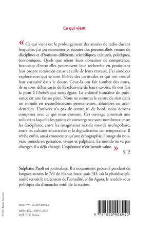 « «Ce qui vient» est le prolongement des années de radio durant lesquelles j'ai pu rencontrer et écouter des personnalités venues de disciplines et d'horizons différents, scientifiques, culturels, politiques, économiques. Quels que soient leurs domaines de compétence, beaucoup d'entre elles poursuivent leur recherche en pratiquant leur propre remise en cause et celle de leurs travaux. J'ai aimé ces explorateurs qui se sont libérés des certitudes et qui ont trouvé leur curiosité dans le doute. Ceux-là ont fait tomber des murs, ils se sont débarrassés de l'exclusivité de leurs savoirs, ils ont fait la peau à l'hubris qui nous égare. La volonté humaine de puissance est une fausse piste. Nous ne sommes le centre de rien dans un monde en recombinaisons permanentes, aléatoires ou accidentelles. L'univers n'a pas de centre ni de bord, nous devons composer avec ce qui nous entoure. Cet ouvrage construit une toile dans laquelle les points de convergence sont nombreux entre les disciplines, entre les imaginaires nés du monde multipolaire, entre les cultures ancestrales et la digitalisation contemporaine. Il révèle enfin, aussi émouvante qu'une échographie, l'image du nouveau monde en gestation, vivant et palpitant. Le monde ne va pas changer, il a déjà changé. L'espérance n'est jamais vaine. » S. P.