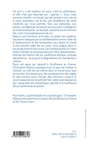 Ce qu'il y a de meilleur en nous, c'est la sublimation, et elle n'est pas réservée aux "génies" : tous, nous sommes créatifs. Le travail, qui est central à nos vies et à notre quotidien, est le lieu par excellence de cette créativité qui nous permet, face aux obstacles, aux échecs, de déployer encore et encore notre intelligence et notre endurance. Le résultat, quand le travail est bien fait, c'est l'accomplissement de soi. Depuis une trentaine d'années, ce plaisir est systématiquement attaqué par le néolibéralisme et son culte de la performance et de l'évaluation, qui réduit le travail à une activité vidée de son sens, nous englue dans la servitude, brise le lien social. Les conséquences sur notre santé mentale et physique peuvent être désastreuses : atteinte de l'estime de soi, souffrance éthique, solitude dévastatrice - et jusqu'à la dégradation du monde de la culture. Dans cet essai qui répond à "Souffrance en France", Christophe Dejours explique tout ce que, de l'artisan à l'artiste, on met de soi-même dans le travail pour que ça marche, les risques pris, les transgressions des règles et des normes pour trouver des solutions, jusqu'à la reconnaissance du travail bien fait, cette reconnaissance qui, lorsqu'elle est authentique, permet à la souffrance de se transformer en plaisir.