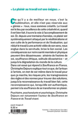 Ce qu'il y a de meilleur en nous, c'est la sublimation, et elle n'est pas réservée aux « génies » : tous, nous sommes créatifs. Le travail est le lieu par excellence de cette créativité et, quand il est bien fait, il aboutit à l'accomplissement de soi. Or, depuis une trentaine d'années, ce plaisir est systématiquement attaqué par le néolibéralisme et son culte de la performance et de l'évaluation, qui réduit le travail à une activité vidée de son sens, nous englue dans la servitude, brise le lien social. Les conséquences sur notre santé mentale et physique peuvent être désastreuses : atteinte de l'estime de soi, souffrance éthique, solitude dévastatrice - et jusqu'à la dégradation du monde de la culture. Dans cet essai qui répond à Souffrance en France, Christophe Dejours explique tout ce que, de l'artisan à l'artiste, on met de soi-même dans le travail pour que ça marche, les risques pris, les transgressions des règles et des normes pour trouver des solutions, jusqu'à la reconnaissance du travail bien fait, cette reconnaissance qui, lorsqu'elle est authentique, permet à la souffrance de se transformer en plaisir.