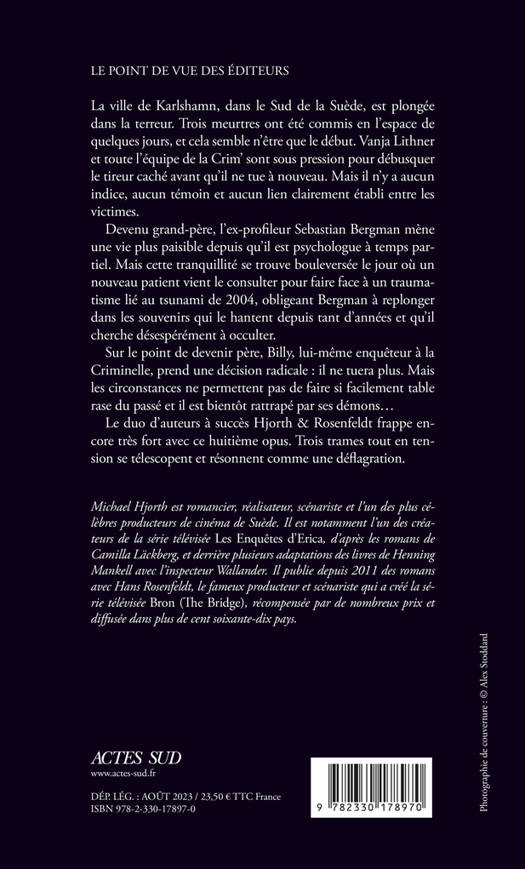 La ville de Karlshamn, dans le Sud de la Suède, est plongée dans la terreur. Trois meurtres ont été commis en l'espace de quelques jours, et cela semble n'être que le début. Vanja Lithner et toute l'équipe de la Crim' sont sous pression pour débusquer le tireur caché avant qu'il ne tue à nouveau. Mais il n'y a aucun indice, aucun témoin et aucun lien clairement établi entre les victimes. Devenu grand-père, l'ex-profileur Sebastian Bergman mène une vie plus paisible depuis qu'il est psychologue à temps partiel. Mais cette tranquillité se trouve bouleversée le jour où un nouveau patient vient le consulter pour faire face à un traumatisme lié au tsunami de 2004, obligeant Bergman à replonger dans les souvenirs qui le hantent depuis tant d'années et qu'il cherche désespérément à occulter. Sur le point de devenir père, Billy, lui-même enquêteur à la Criminelle, prend une décision radicale : il ne tuera plus. Mais les circonstances ne permettent pas de faire si facilement table rase du passé et il est bientôt rattrapé par ses démons... Le duo d'auteurs à succès Hjorth & Rosenfeldt frappe encore très fort avec ce huitième opus. Trois trames tout en tension se télescopent et résonnent comme une déflagration.