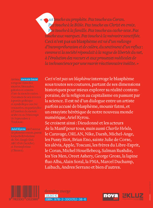 « Pas touche au Prophète. Pas touche à la Nation. Pas touche au Christ en croix. Pas touche à la famille. Pas touche aux marques. Pas touche au cache-sexe. Pas touche à la mémoire sanctifiée. «Ceci n'est pas un blasphème» est né d'un mélange d'incompréhension et de colère. Du sentiment d'un reflux, comme si la société répondait à la vague de libertés du net, à l'évolution des moeurs et aux prouesses médicales de la technoscience par une marée réactionnaire plus ou moins avouée, diffuse, et à la longue très pesante ». «Ceci n'est pas un blasphème» interroge le blasphème sous toutes ses coutures, de ses dimensions historiques à sa réalité contemporaine, de la religion aux marques en passant par la science. Il est né d'un dialogue entre un artiste qui a été lui-même censuré à de multiples repr