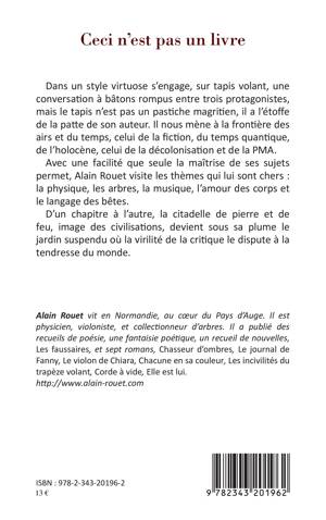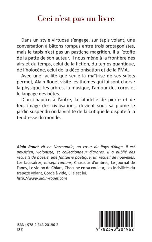 Dans un style virtuose s'engage, sur tapis volant, une conversation à bâtons rompus entre trois protagonistes qui nous mène à la frontière des airs et du temps, celui de la fiction, du temps quantique, de l'holocène, celui de la décolonisation et de la PMA. Alain Rouet visite les thèmes qui lui sont chers : la physique, les arbres, la musique, l'amour des corps et le langage des bêtes. D'un chapitre à l'autre, la citadelle de pierre et de feu, image des civilisations, devient sous sa plume le jardin suspendu où la virilité de la critique le dispute à la tendresse du monde.