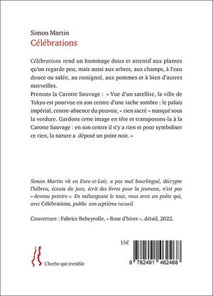 Célébrations rend un hommage doux et attentif aux plantes qu’on regarde peu, mais aussi aux arbres, aux champs, à l’eau douce ou salée, au rossignol, aux pommes et à bien d’autres merveilles. Prenons la Carotte Sauvage : «Vue d’un satellite, la ville de Tokyo est pourvue en son centre d’une tache sombre : le palais impérial, centre-absence du pouvoir, « rien sacré » masqué sous la verdure. Gardons cette image en tête et transposons-la à la Carotte Sauvage : en son centre il n’y a rien et pour symboliser ce rien, la nature a déposé un point noir. »