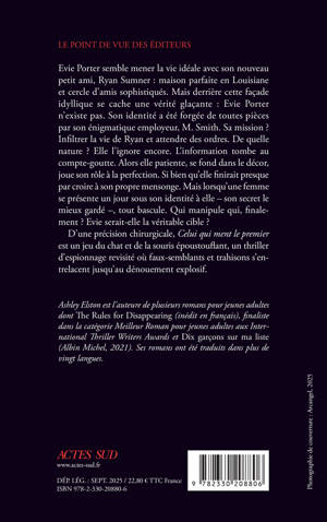 Evie Porter a tout pour elle. Une belle maison, un petit ami parfait, des amis sophistiqués. Une vie de rêve. Seulement, Evie Porter n'existe pas. Son identité a été inventée de toutes pièces par son mystérieux patron, Mr. Smith. Sa mission : s'infiltrer dans la vie de Ryan Sumner et attendre de nouveaux ordres. Mais lorsqu'une femme se présente un jour sous sa véritable identité - son secret le mieux gardé -, tout bascule. Qui manipule qui, finalement ? Serait-ce en réalité Evie, la cible ? D'une précision chirurgicale, Ashley Elston manipule brillamment son lecteur dans ce thriller d'espionnage revisité où faux-semblants et trahisons s'entrelacent pour un dénouement aussi surprenant qu'implacable.