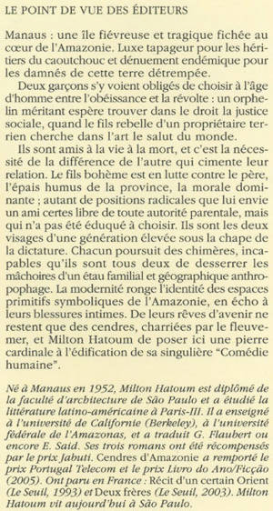 Manaus : une île fiévreuse et tragique fichée au coeur de l'Amazonie. Luxe tapageur pour les héritiers du caoutchouc et dénuement endémique pour les damnés de cette terre détrempée. Deux garçons s'y voient obligés de choisir à l'âge d'homme entre l'obéissance et la révolte : un orphelin méritant espère trouver dans le droit la justice sociale, quand le fils rebelle d'un propriétaire terrien cherche dans l'art le salut du monde. Ils sont amis à la vie à la mort, et c'est la nécessité de la différence de l'autre qui cimente leur relation. Le fils bohème est en lutte contre le père, l'épais humus de la province, la morale dominante ; autant de positions radicales que lui envie un ami certes libre de toute autorité parentale, mais qui n'a pas été éduqué à choisir. Ils sont les deux visages d'une génération élevée sous la chape de la dictature. Chacun poursuit des chimères, incapables qu'ils sont tous deux de desserrer les mâchoires d'un étau familial et géographique anthropophage. La modernité ronge l'identité des espaces primitifs symboliques de l'Amazonie, en écho à leurs blessures intimes. De leurs rêves d'avenir ne restent que des cendres, charriées par le fleuvemer, et Milton Hatoum de poser ici une pierre cardinale à l'édification de sa singulière "Comédie humaine". Né à Manaus en 1952, Milton Hatoum est diplômé de la faculté d'architecture de São Paulo et a étudié la littérature latino-américaine à Paris-III. Il a enseigné à l'université de Californie (Berkeley), à l'université fédérale de l'Amazonas, et a traduit G. Flaubert ou encore E. Said. Ses trois romans ont été récompensés par le prix Jabuti. Cendres d'Amazonie a remporté le prix Portugal Telecom et le prix Livro do Ano/Ficção (2005). Ont paru en France : Récit d'un certain Orient (Le Seuil, 1993) et Deux frères (Le Seuil, 2003). Milton Hatoum vit aujourd'hui à São Paulo.