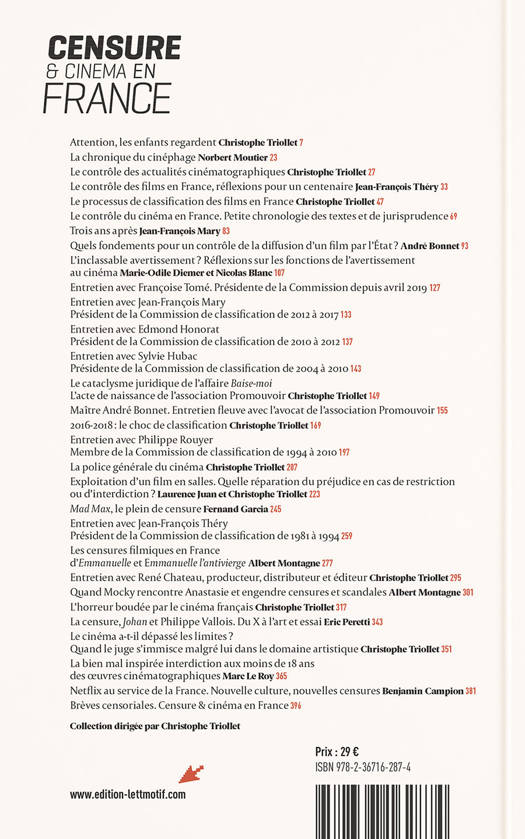Sixième volume de la collection Darkness consacrée à la censure au cinéma. Censure & cinéma en France examine sur plus de 450 pages, le processus complexe de la classification des œuvres cinématographiques dans notre pays. La parole a été donnée aux observateurs et aux acteurs du dispositif organisé par l’État depuis 1919. Jean-François Théry, Sylvie Hubac, Edmond Honorat, Jean-François Mary et Françoise Tomé, tous interrogés au moment de leur présidence, ont accepté de livrer leur point de vue sur le travail de la Commission de classification. André Bonnet, fondateur et conseil de l’association Promouvoir, laquelle a bouleversé le droit du cinéma depuis plus de vingt ans avec l’affaire Baise-moi, explique et justifie ses multiples actions devant le juge. Si René Chateau, Philippe Rouyer et Fernand Garcia ont choisi de revenir sur des épisodes importants de la classification des films, des juristes se sont interrogés sur la finalité de l’avertissement, sur les incohérences de l’interdiction aux moins de 18 ans, ou encore sur l’indemnisation des professionnels lésés par des restrictions d’exploitation en salles. Au total, quinze auteurs ont bien voulu poser un regard critique sur un dispositif complexe observé avec méfiance par une industrie du cinéma partagée entre agacement et résignation.