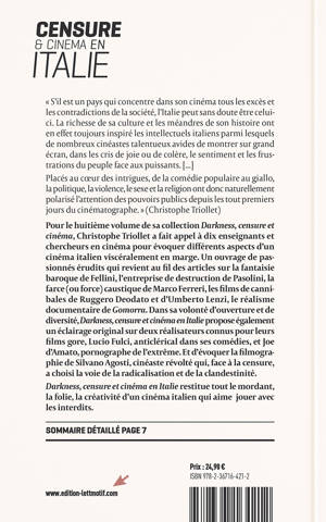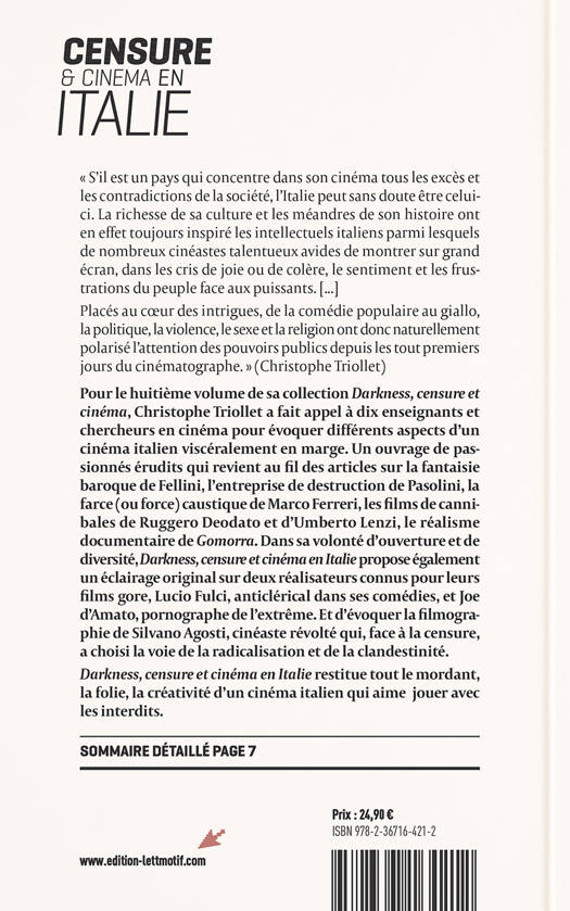 Pour le huitième volume de sa collection Darkness, censure et cinéma, Christophe Triollet a fait appel à dix enseignants et chercheurs en cinéma pour évoquer différents aspects d’un cinéma italien viscéralement en marge. Un ouvrage de passionnés érudits qui revient au fil des articles sur la fantaisie baroque de Fellini, l’entreprise de destruction de Pasolini, la farce (ou force) caustique de Marco Ferreri, les films de cannibales de Ruggero Deodato et d’Umberto Lenzi, le réalisme documentaire de Gomorra. Dans sa volonté d’ouverture et de diversité, Darkness, censure et cinéma en Italie propose également un éclairage original sur deux réalisateurs connus pour leurs films gore, Lucio Fulci, anticlérical dans ses comédies, et Joe d’Amato, pornographe de l’extrême. Et d’évoquer la filmographie de Silvano Agosti, cinéaste révolté qui, face à la censure, a choisi la voie de la radicalisation et de la clandestinité.
