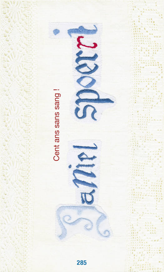 Assembler, piéger, explorer, coller, détourner, immortaliser, collectionner, autant de mots définissant le travail de Daniel Spoerri. Tout au long de sa carrière, il a incité le spectateur à interagir avec des œuvres souvent inattendues, incongrues, farceuses voire débridées. Passionné par les mots, comme en attestent ses célèbres « Pièges à mots », il les met à l'honneur dans Cent ans sans sang ! Pour le centième titre de la collection « L'art en écrit », il joue sur les homonymes du mot « cent », dans un hommage à La Femme 100 têtes de Max Ernst. À partir des multiples sens donnés à une unique sonorité, Spoerri composerait-il d'une seule phrase un véritable engagement pacifiste ?
