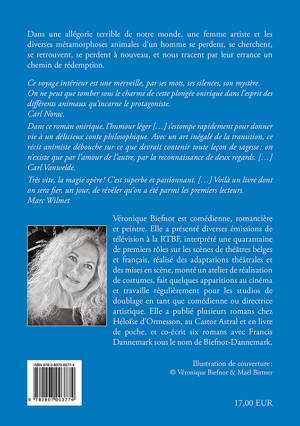 Dans une allégorie terrible de notre monde, une femme artiste et les diverses métamorphoses animales d’un homme se perdent, se cherchent, se retrouvent, se perdent à nouveau, et nous tracent par leur errance un chemin de rédemption.<br /> Un roman qui s’apparente au conte, en même temps qu’une allégorie.<br /> "Ce voyage intérieur est une merveille, par ses mots, ses silences, son mystère.<br /> On ne peut que tomber sous le charme de cette plongée onirique dans l’esprit des différents animaux qu’incarne le protagoniste." (Carl Norac)<br /> "Un délicieux conte philosophique [...] On sort ravi de suivre Véronique Biefnot dans un pareil récit dont l’écriture ciselée reste en permanence au service des questions qu’elle soulève en une joyeuse bousculade." (Carl Vanwelde)<br /> "Très vite, la magie opère ! C’est superbe et passionnant [...]" (Marc Wilmet).<br /> Véronique Biefnot est comédienne, romancière et peintre.<br /> Elle a présenté diverses émissions de télévision à la RTBF ; interprété une quarantaine de premiers rôles sur les scènes de théâtres belges et français, réalisé des adaptations théâtrales et des mises en scène, monté un atelier de réalisation de costumes, fait quelques apparitions au cinéma et travaille régulièrement pour les studios de doublage en tant que comédienne ou directrice artistique.<br /> Plusieurs de ses romans ont été publiés chez Héloïse d’Ormesson, au Castor Astral et en livre de poche. Elle a aussi co-écrit six romans avec Francis Dannemark sous le nom d’auteur de Biefnot-Dannemark.<br />