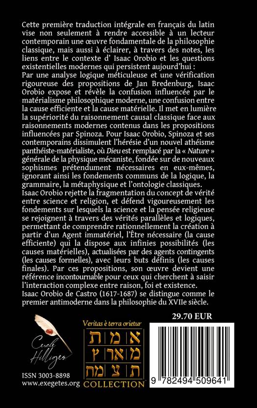 Cette première traduction intégrale en français du latin vise non seulement à rendre accessible à un lecteur contemporain une oeuvre fondamentale de la philosophie classique, mais aussi à éclairer, à travers des notes, les liens entre le contexte d'Isaac Orobio et les questions existentielles modernes qui persistent aujourd'hui : Par une analyse logique méticuleuse et une vérification rigoureuse des propositions de Jan Bredenburg, Isaac Orobio expose et révèle la confusion influencée par le matérialisme philosophique moderne, une confusion entre la cause efficiente et la cause matérielle. Il met en lumière la supériorité du raisonnement causal classique face aux raisonnements modernes contenus dans les propositions influencées par Spinoza. Pour Isaac Orobio, Spinoza et ses contemporains dissimulent l'hérésie d'un nouvel athéisme panthéiste-matérialiste, où Dieu est remplacé par la « Nature » générale de la physique mécaniste, fondée sur de nouveaux sophismes prétendument nécessaires en eux-mêmes, ignorant ainsi les fondements communs de la logique, la grammaire, la métaphysique et l'ontologie classiques. Isaac Orobio rejette la fragmentation du concept de vérité entre science et religion, et défend vigoureusement les fondements sur lesquels la science et la pensée religieuse se rejoignent à travers des vérités parallèles et logiques, permettant de comprendre rationnellement la création à partir d'un Agent immatériel, l'Être nécessaire (la cause efficiente) qui la dispose aux infinies possibilités (les causes matérielles), actualisées par des agents contingents (les causes formelles), avec leurs buts définis (les causes finales). Par ces propositions, son oeuvre devient une référence incontournable pour ceux qui cherchent à saisir l'interaction complexe entre raison, foi et existence.