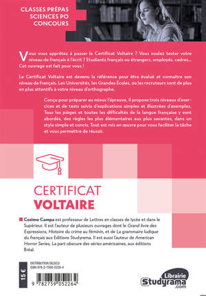 Cet ouvrage vous permet de découvrir au travers d’exercices toutes les règles de la langue française classées selon trois niveaux de difficulté. Il contient toutes les clefs pour la réussite du Certificat Voltaire, référence pour prouver son niveau de français auprès des universités, grandes écoles ou recruteurs, qui souvent en réclament une bonne maîtrise.